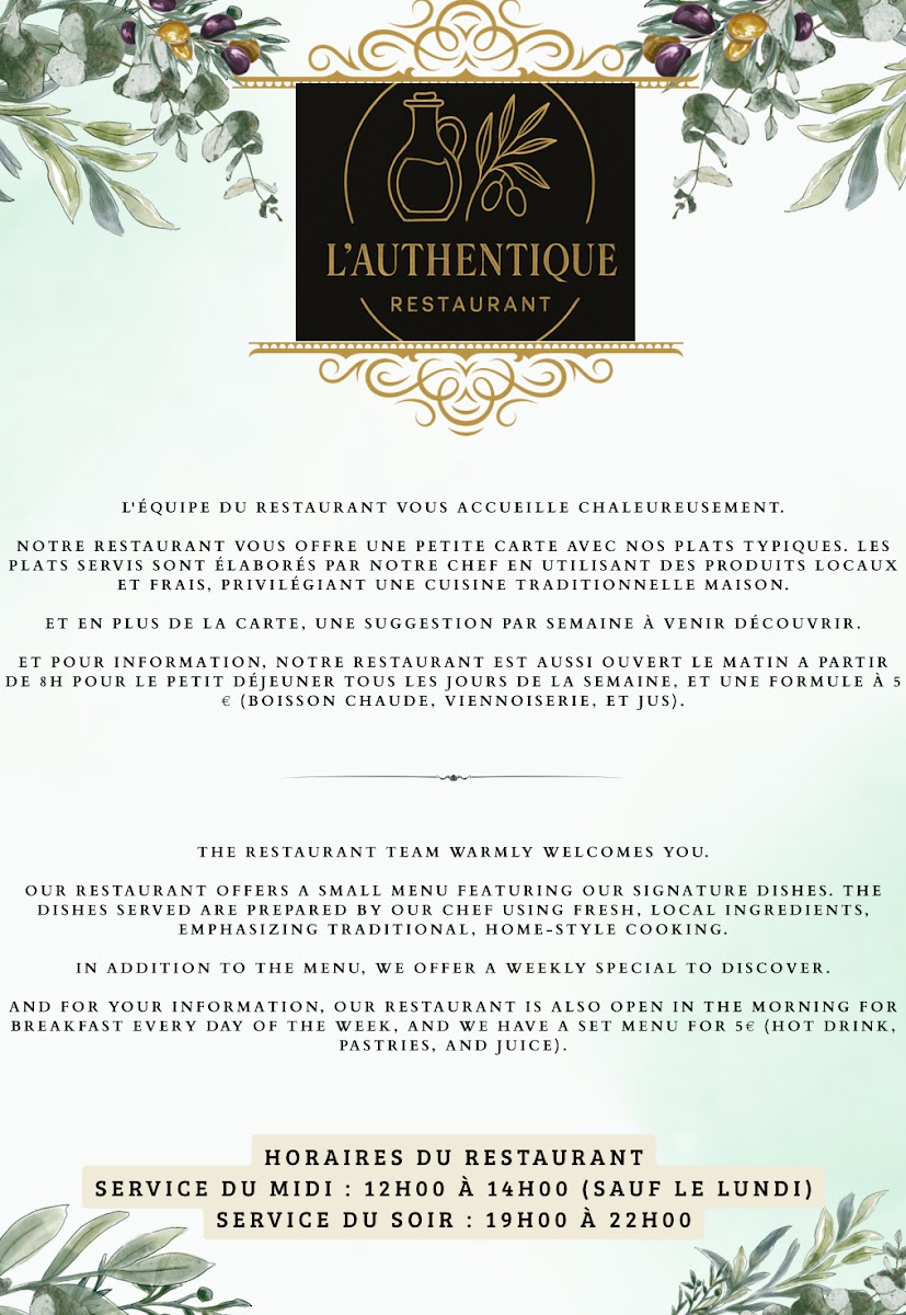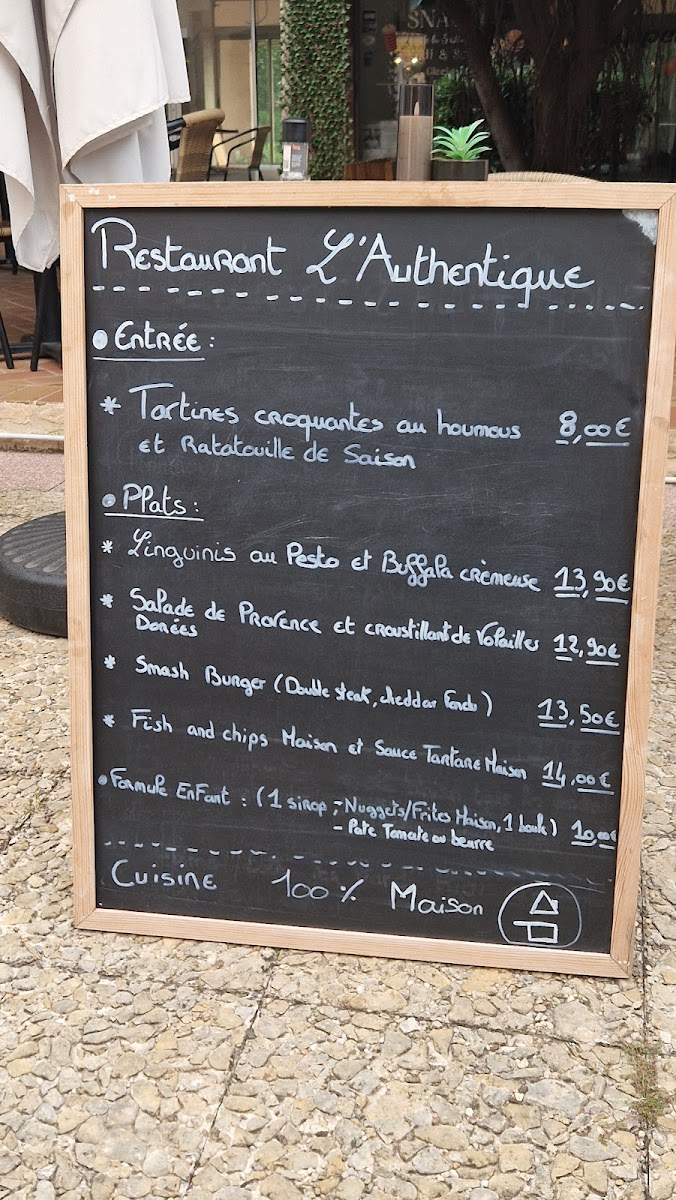 From a reviewer’s perspective, the menu at Restaurant L'authentique offers a concise yet thoughtful selection that reflects a focus on homemade and seasonal cuisine. The Présentation du restaurant sets the tone for a traditional dining experience, while the Entrée et Formule Enfant provides accessible options for both adults and children, making it suitable for families. The Menu platsDessert maison stands out by emphasizing house-made desserts, adding a comforting, authentic touch to the meal. Finally, the Suggestion de la semaine brings variety and freshness to the menu, likely highlighting seasonal ingredients and the chef’s creativity. Overall, the menu appears well-balanced, with clearly structured sections and pricing that seems aligned with a casual seaside dining experience, making it a pleasant option for those looking for simple, authentic French dishes in Saint-Raphaël.